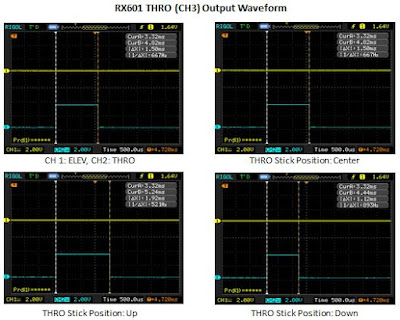 Before a program can be made to process the PWM signals, we need to know how they look. The photo below shows the division of the channels on the RX601 receiver.
