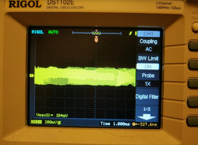 5. Below is the ripple (around 184mV) measured after a 2A load is added to the DUT's output.